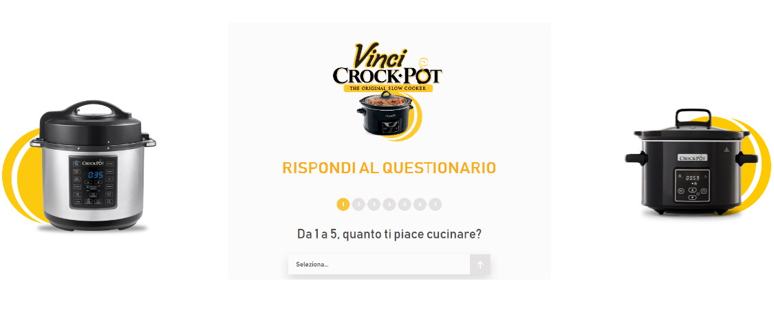 Recati sul sito dedicato al concorso, completa il questionario e registrati con i tuoi dati: scoprirai subito se hai vinto una Crock-Pot Slow Cooker da 2,4 litri digitale, la pentola per cottura lenta a bassa temperatura adatta fino a 2 persone del valore di Euro 45,00. Inoltre parteciperai all’estrazione finale di 5 Crock-pot Express Multi-Cooker – 5.6 litri – del valore di Euro 114,67!